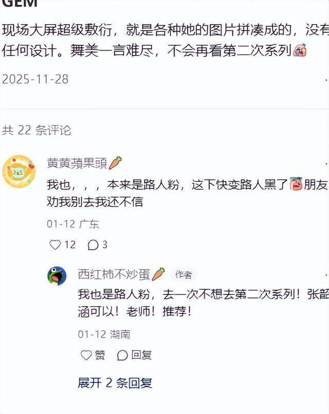 还有追过她线下的网友爆料说,她表演的成分太多,每次哭的时间都是掐准了的,每次演唱会只要一到点,音乐一出来,粉丝就知道她接下来会说什么,台词没变过。