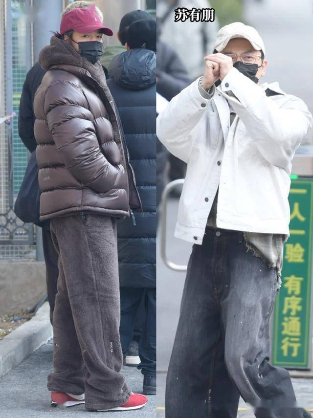 宋威龙的红黑撞色内搭在雪景中格外醒目,被网友趣称为"年兽本兽",王安宇穿着驼色大衣配黑色针织帽,文艺范儿十足。