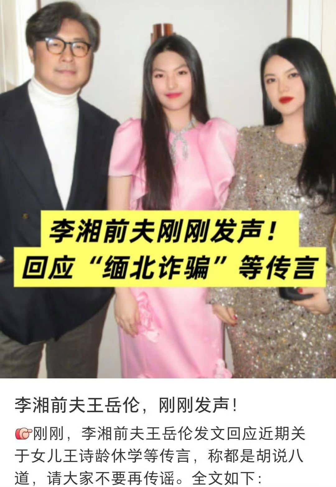 女儿王诗龄被传休学,前妻李湘被传涉缅北诈骗,王岳伦站出来全都否认,还顺便警告网友不要以讹传讹——引言。