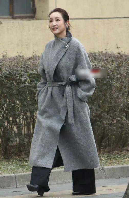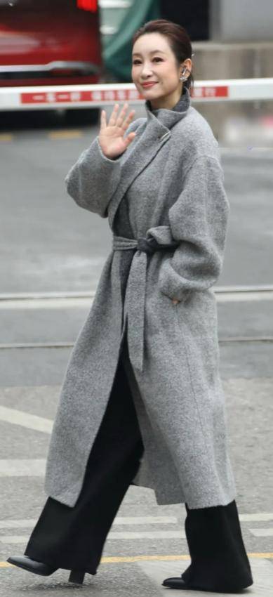 她身着一件灰色毛呢大衣,搭配剪裁合身的黑色长裤与短靴,宽松外套与利落下装形成反差,既遮肉又显挺拔气场。