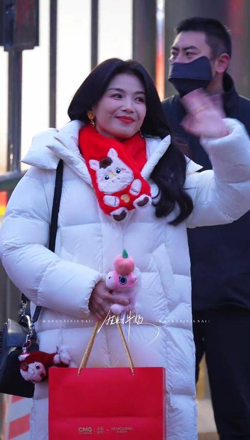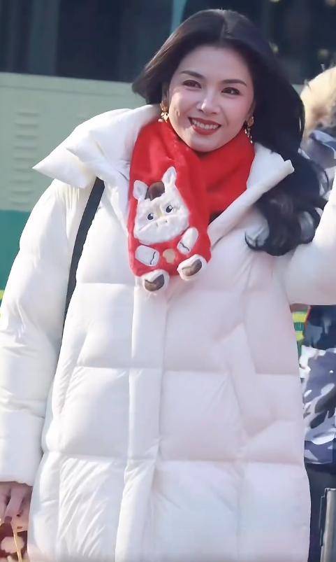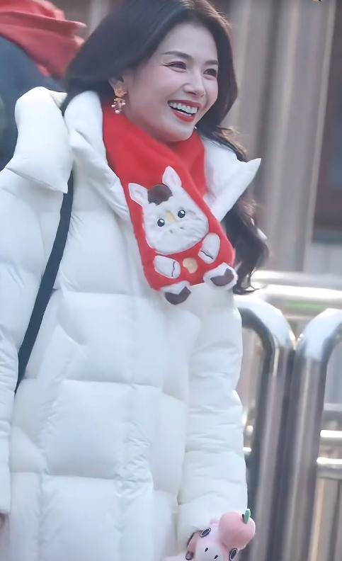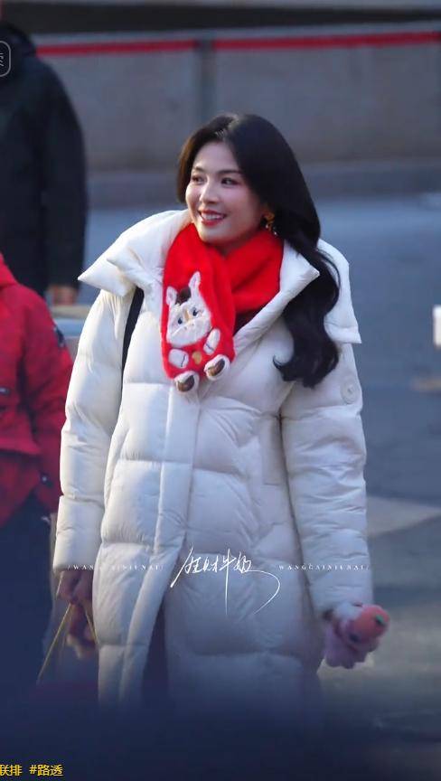 她穿了件宽松的白色棉袄,裹得严实却难掩身形。里面搭配的红色长裙隐约露出边角,喜庆又不失精致,和舞台造型形成巧妙呼应。