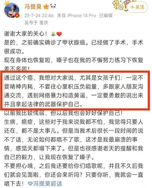 虽然甲状腺癌中乳头状癌治愈率较高,但长期情绪内耗会增加患病风险,这也印证了冯提莫提醒大家别内耗的初衷。