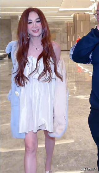 她身穿一件橙红色抹胸裙,裙子还有胸部镂空的设计,外面披了一件貂大衣,依旧是标志性的披肩长发,整体造型又浮夸又俗气,看得人有些辣眼。