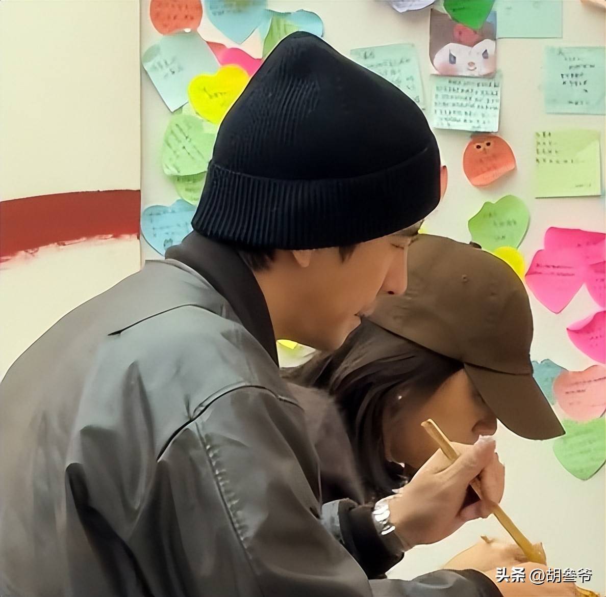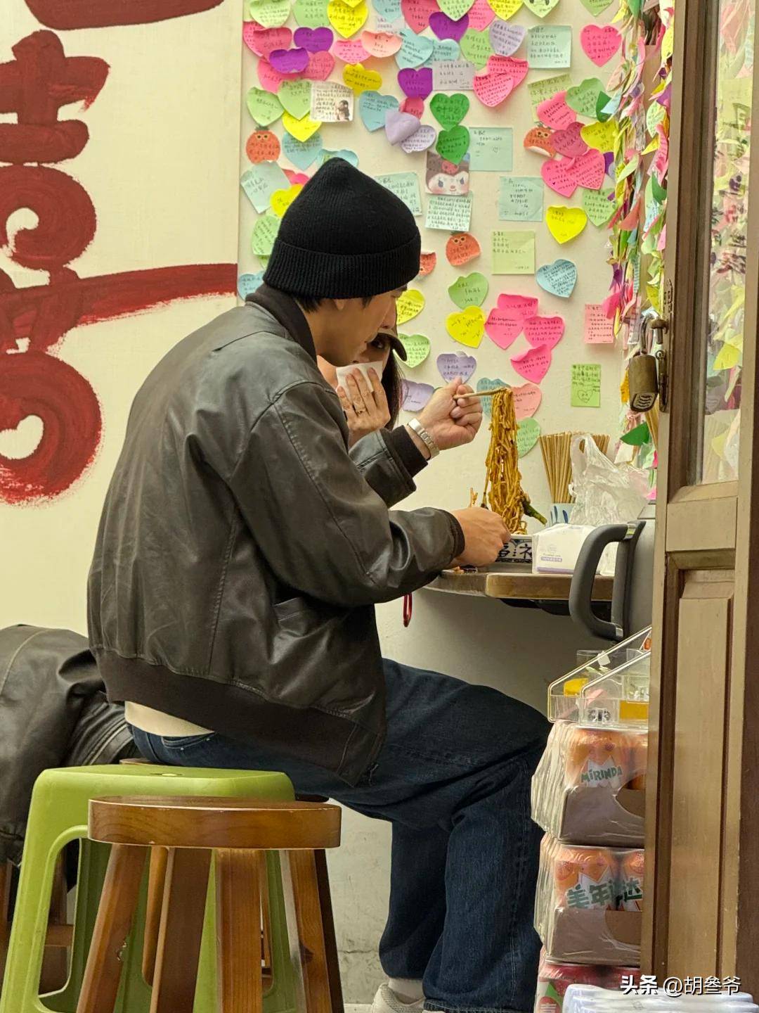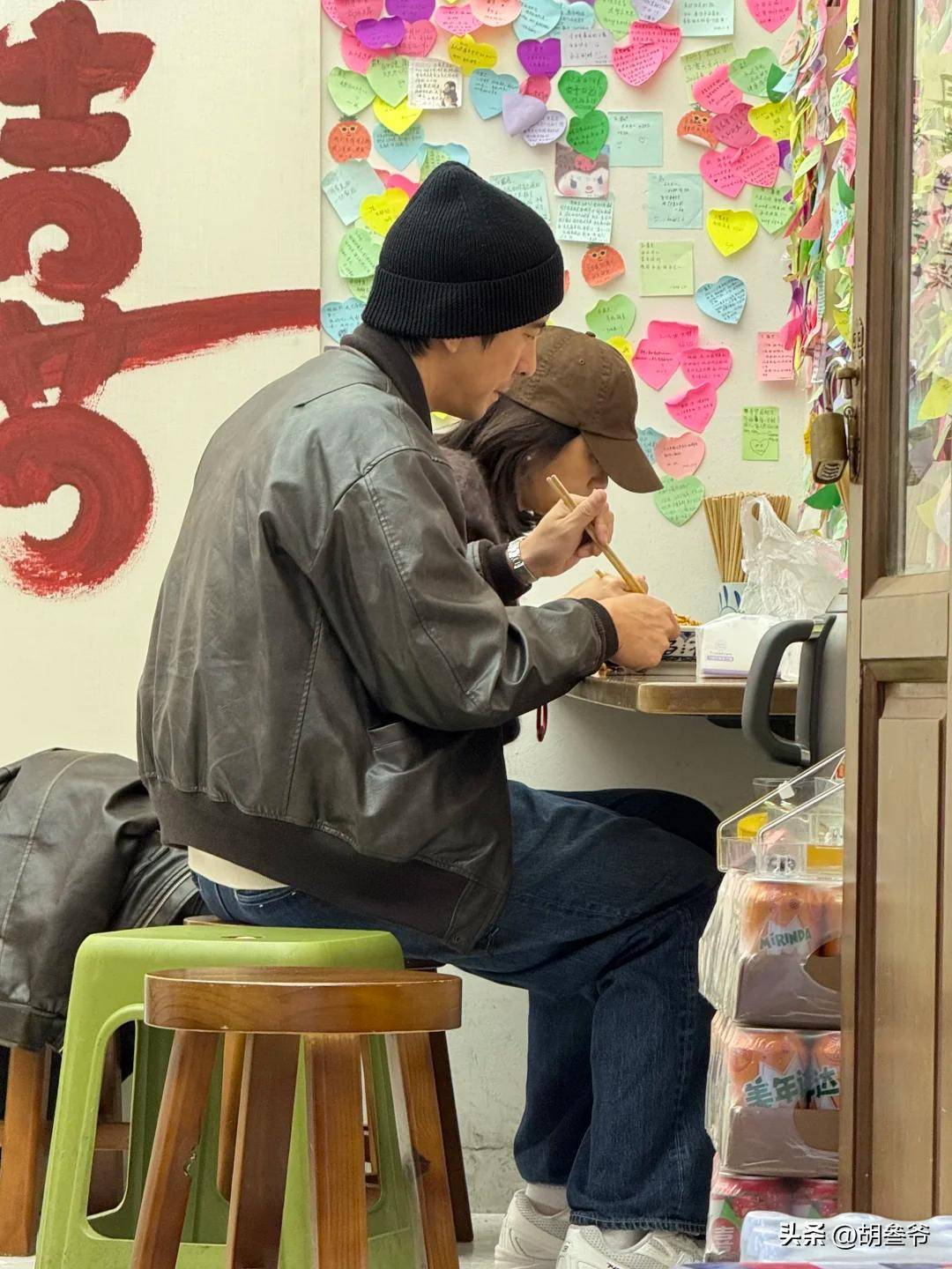 贾静雯和修杰楷戴着同款鸭舌帽,穿一身情侣款黑色皮衣,低头嗦面的样子像极了普通小夫妻。
