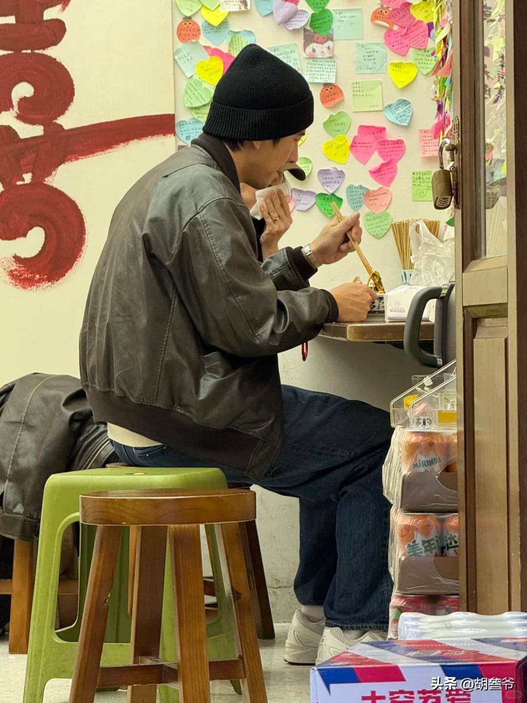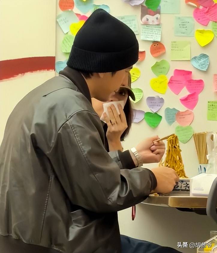 拍摄者说,两人全程没要求店员清场,也没戴口罩墨镜,就安安静静坐在角落吃面。