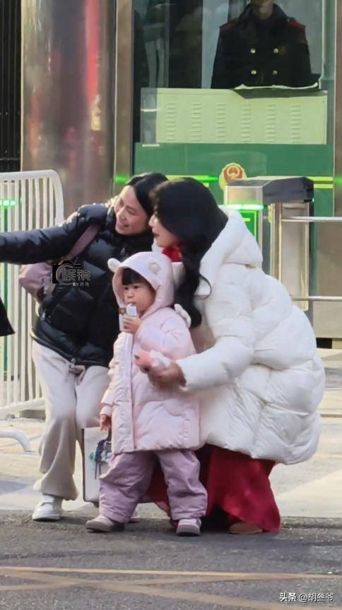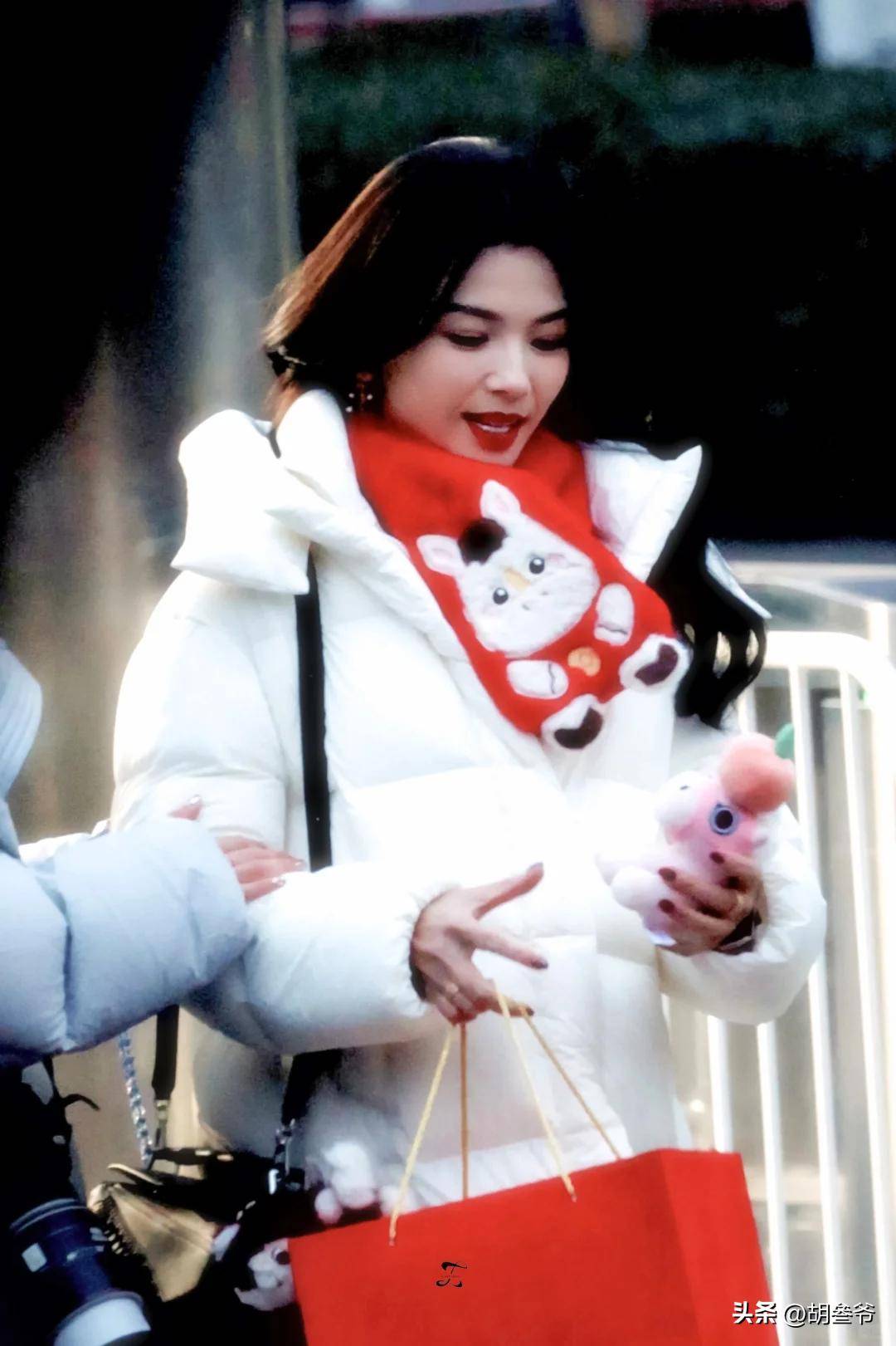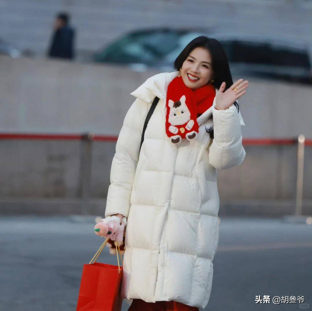 另一套白色羽绒服配红色小马围巾则呼应马年主题,被调侃为“过年回家塞红包的漂亮妈咪”。