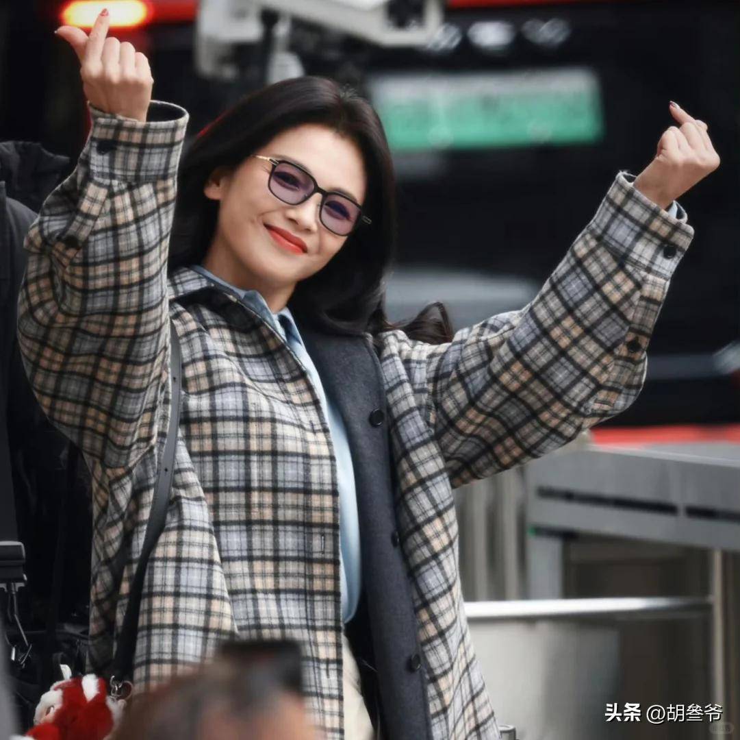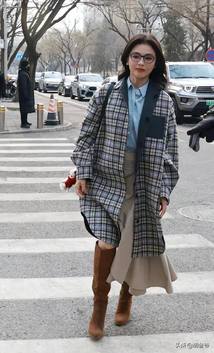 在春晚联排现场,她穿着白色格纹大衣,搭配红色衬衫,造型精致有质感。