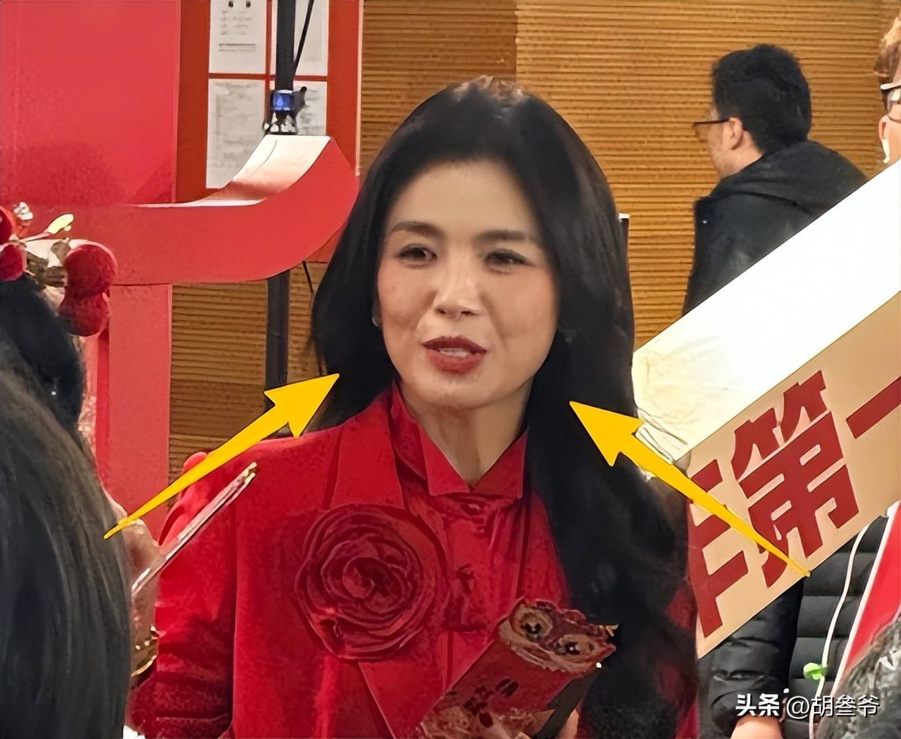 本来刘涛的肤色就不是特别白,再配上全红的穿搭,显得气色有点暗黄,甚至有点村。