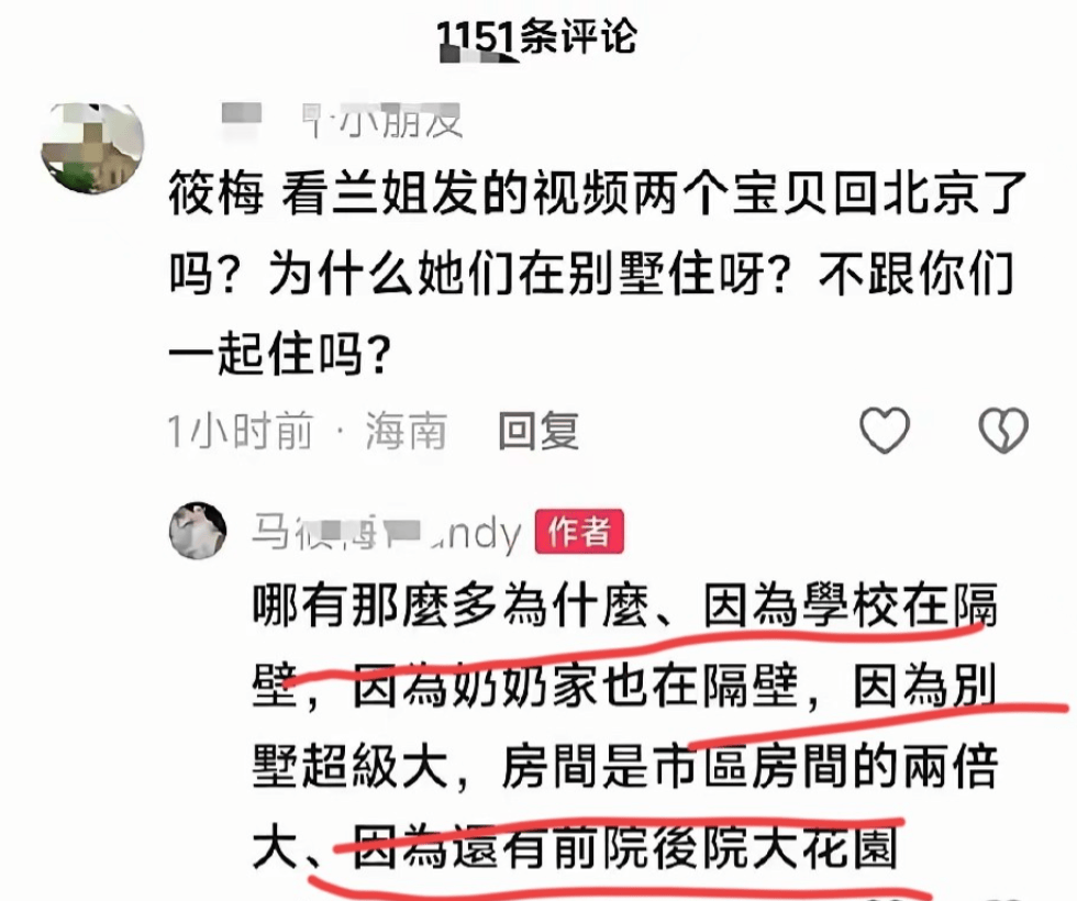 马筱梅直接回应:没有为什么,首先学校在隔壁是想让孩子们多熟悉下新的学校,马上他们就要从台北转回北京读书了,其次奶奶的别墅超级大,是比他们住市区房子的两倍,而且前院后院还有大花园,孩子们可以跑来跑去也方便,养个小宠物种个花啥的都好。