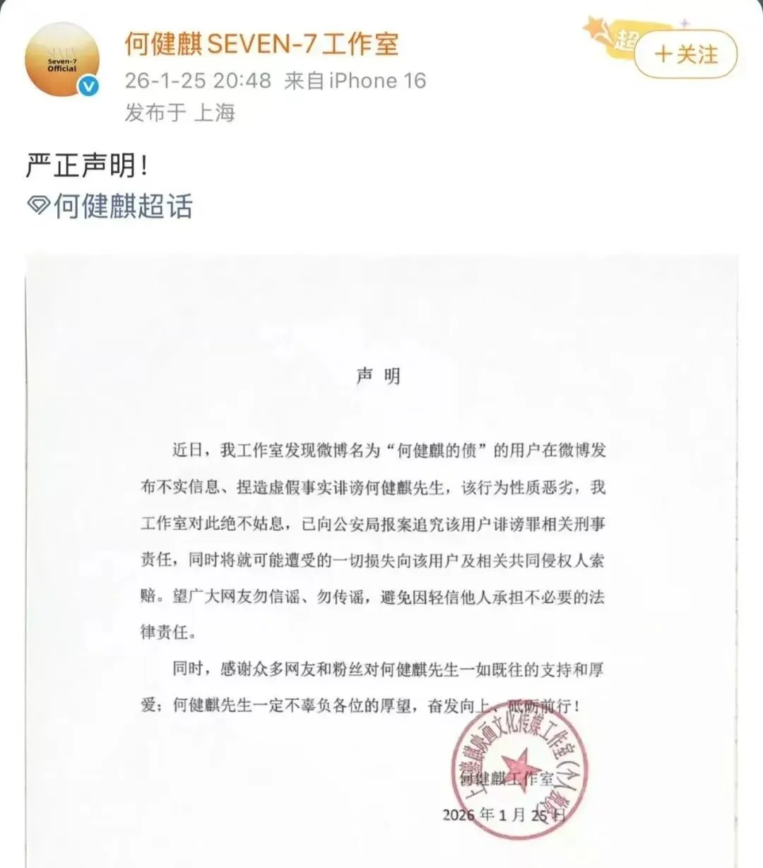 一个多小时后,何健麒工作室就发了严正声明,称上述言论为不实信息,该网友的行为属于捏造事实诽谤何健麒先生,已向公安机关报案追究其刑事责任。
