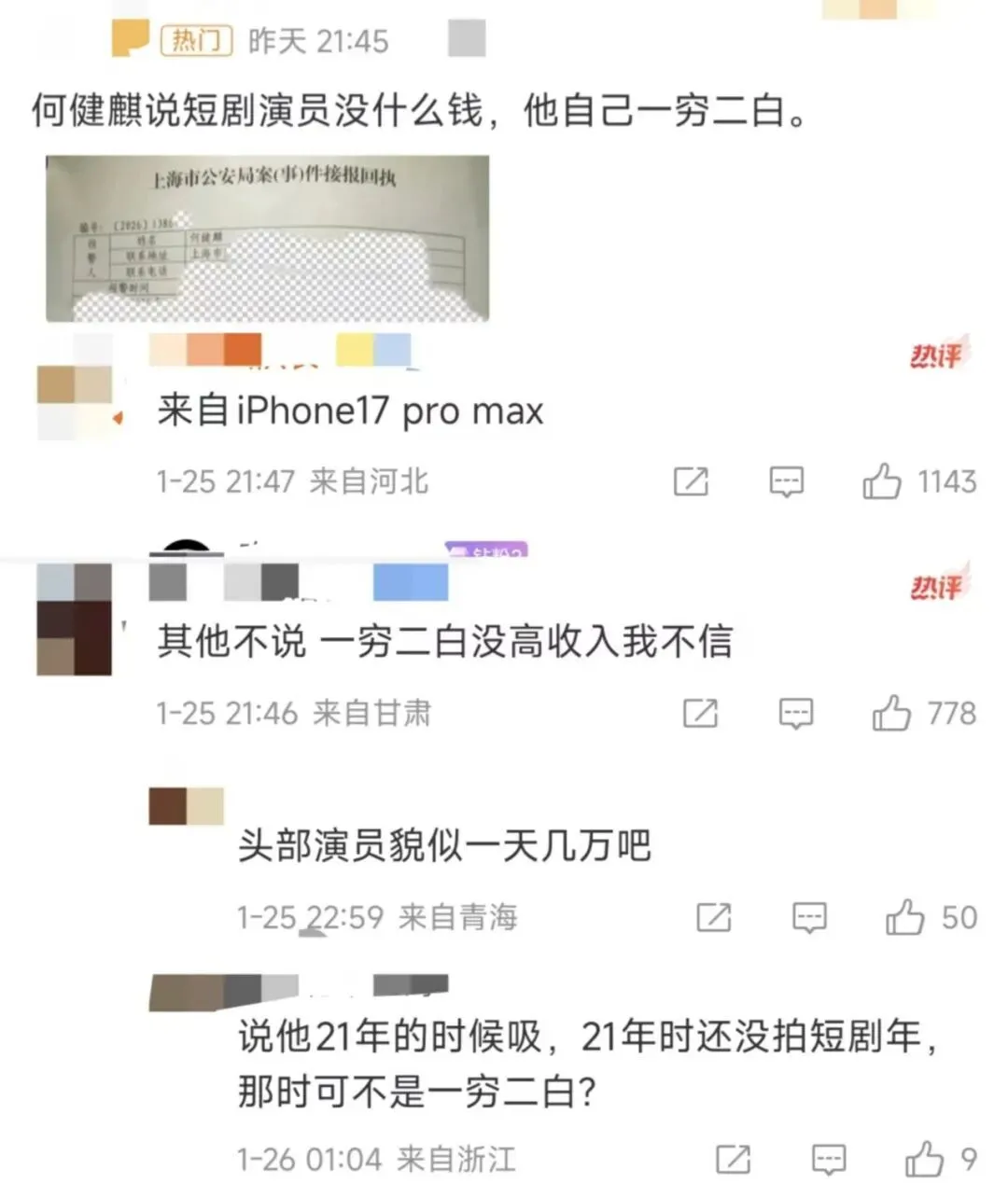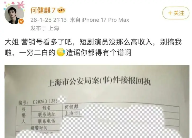 何健麒本人也发了微博回应:“大姐 营销号看多了吧 短剧演员没那么高收入,别搞我啦。一穷二白的,造谣你得有个谱啊。”