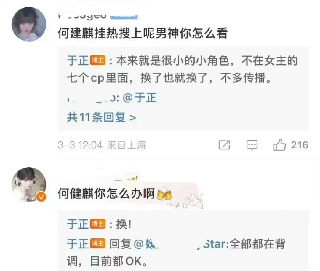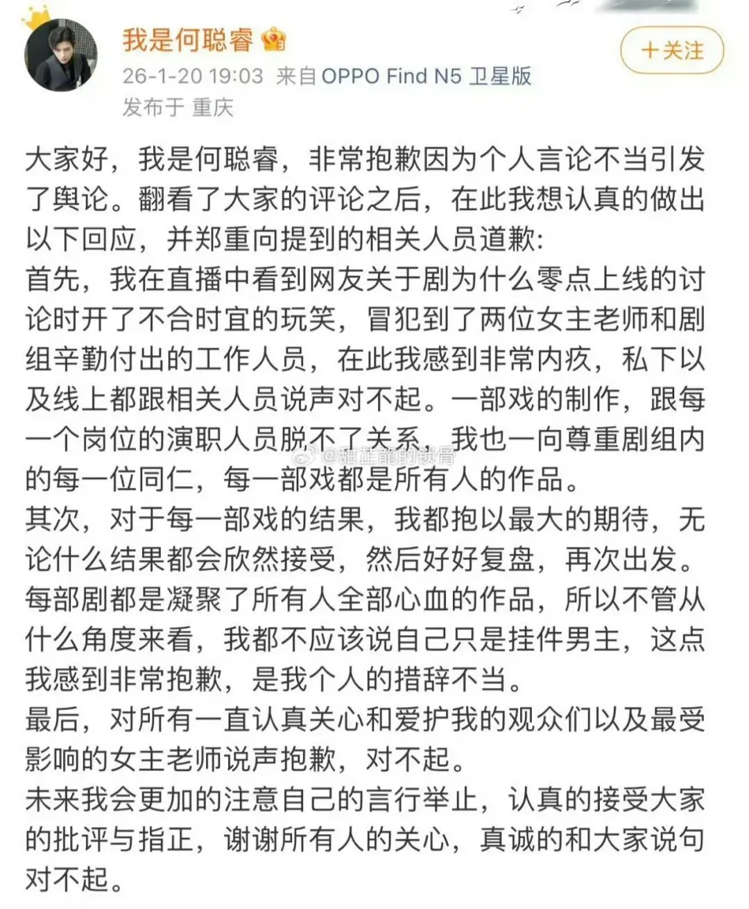 随后,可能是顶不住舆论压力,何聪睿发文道歉了,称自己开了不合时宜的玩笑,“冒犯到了两位女主老师和剧组辛勤付出的工作人员,在此我感到非常内疚,私下以及线上都跟相关人员说声对不起。”,“不管从什么角度来看,我都不应该说自己只是挂件男主”。