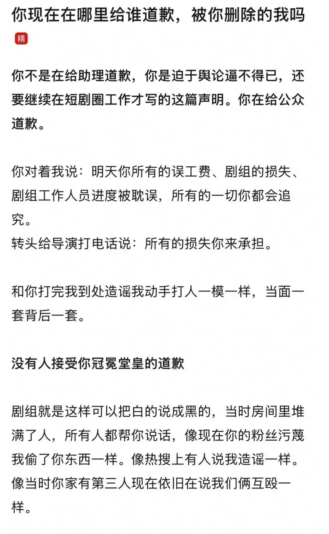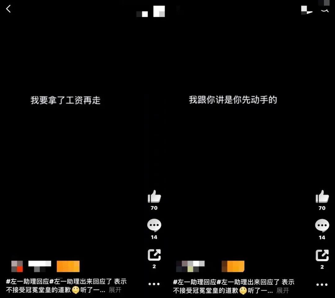 与此同时,助理小馒也出来回应,说自己不接受左一冠冕堂皇的道歉。两人又在公共平台“打起来了”。