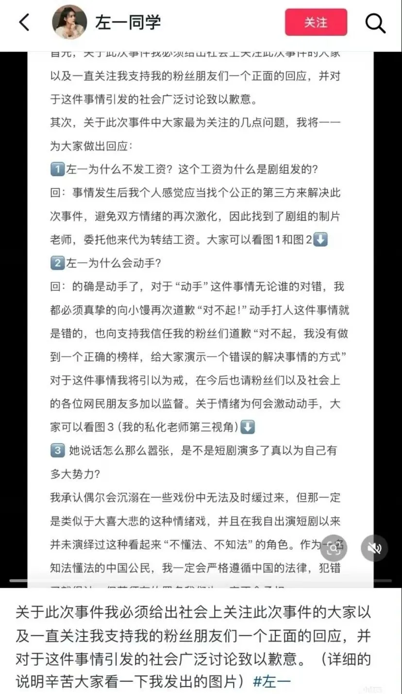 事情发生在25年的9月24日,短剧女演员左一和小馒由于薪资问题发生了肢体冲突,随后报了警,警察鉴定为互殴。