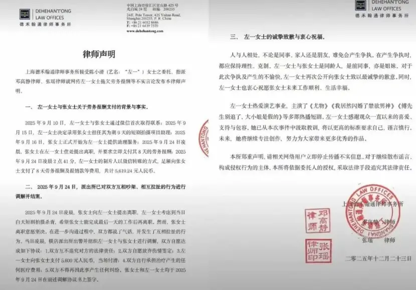 12月23日晚,左一又委托律师发布声明称双方已经调解。