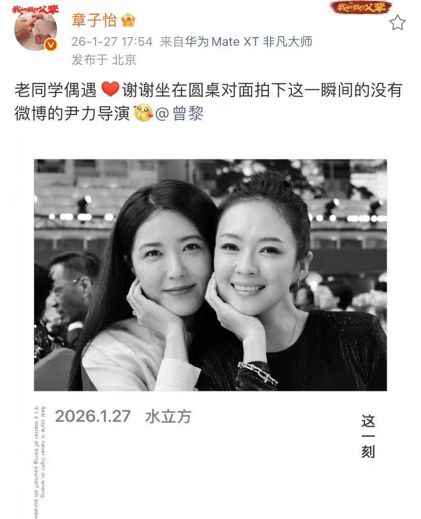 目前章子怡参加百花迎春晚会的录制,遇到老同学曾黎。尹力给章子怡和曾黎拍摄的照片,她们是中戏96级的同班同学,曾黎比章子怡大三岁,已经49岁,而章子怡2月9日迎来47岁生日,她们感