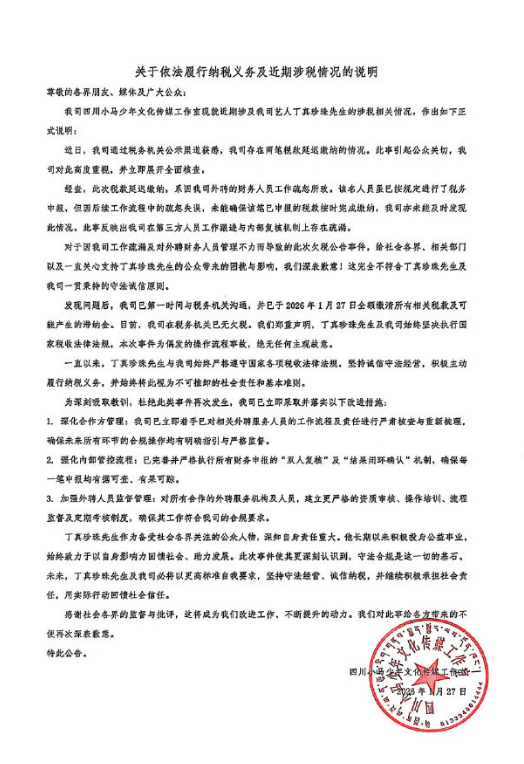 1月27日,丁真名下工作室欠税3.4万被公告引发热议,对此,丁真工作室发布涉税情况说明,称出现的税款延迟缴纳是由外聘的财务人员疏忽导致,发现问题后已经与税务机关沟通,并在今天全