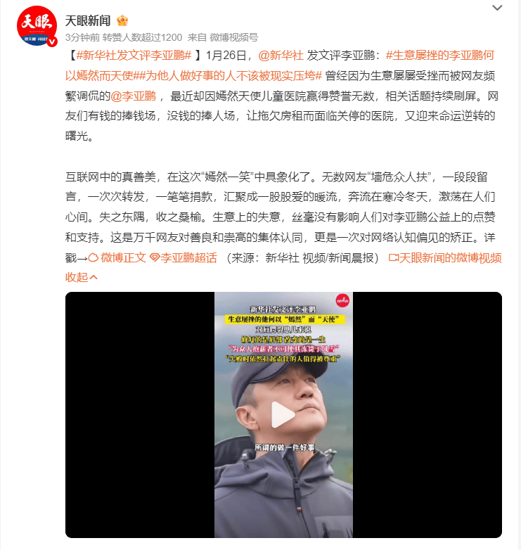 (来源:综合新华社、天眼新闻 记者:李志浩、阳娜)曾经因为生意屡屡受挫而被网友频繁调侃的李亚鹏,最近却因嫣然天使儿童医院赢得赞誉无数,相关话题持续刷屏。网友们有钱的捧钱场,没