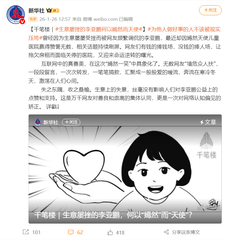 失之东隅,收之桑榆。生意上的失意,丝毫没有影响人们对李亚鹏公益上的点赞和支持。这是万千网友对善良和崇高的集体认同,更是一次对网络认知偏见的矫正。