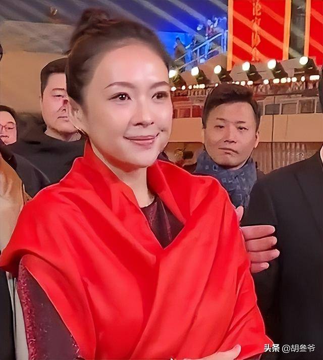转头现身百花迎春晚会,她换上了一身酱红色礼服,外搭大红披肩,喜庆又亮眼。