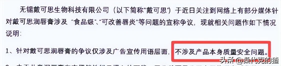 涉事产品是戴可思一款儿童唇膏,电商平台宣传其为“食品级润唇膏”“宝宝误舔无忧”。