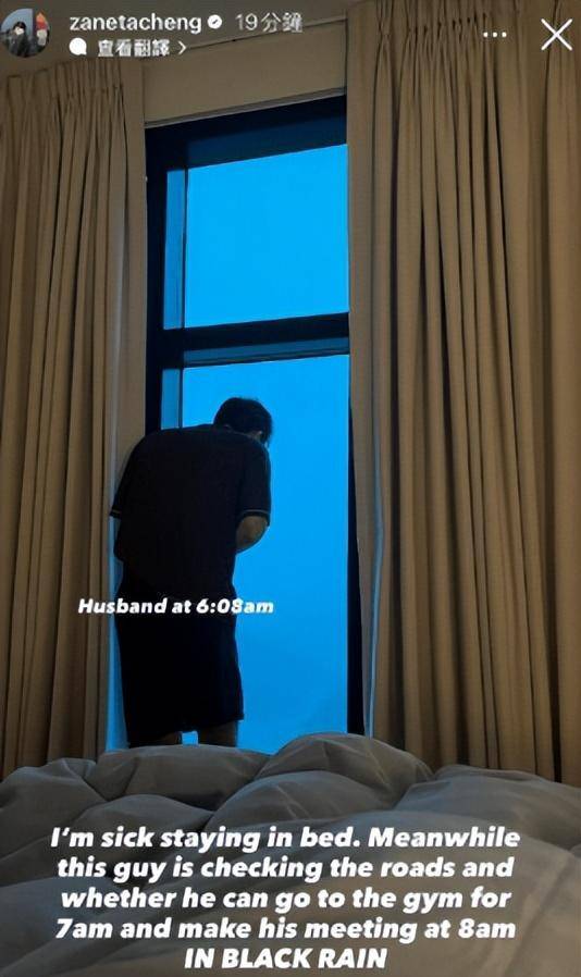据郑瑶透露,在香港狂风暴雨下,她的丈夫Jacob,还是按照原计划去健身,健身后再去公司准点参加会议,没有什么事情可以阻止丈夫的计划,言语中郑瑶对丈夫的行为十分敬佩。
