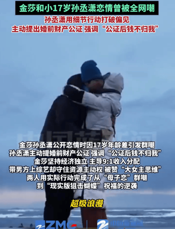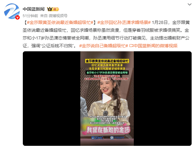 1月28日,金莎跟黄圣依说最近备婚超级忙,回忆求婚场景称虽然浪漫,但是穿着羽绒服被求婚很搞笑。金莎和小17岁孙丞潇恋情曾被全网嘲,孙丞潇用细节行动打破偏见,主动提出婚前财产公证,强调“公证后钱不归我”。