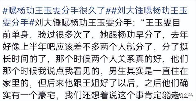 1月27日,狗仔刘大锤的一场直播,让内娱炸开了锅。他在直播中明确爆料:“王玉雯目前单身,验过很多次了,她跟杨玏早分了,去年上半年差不多就分了。”这话一出,瞬间冲上热搜