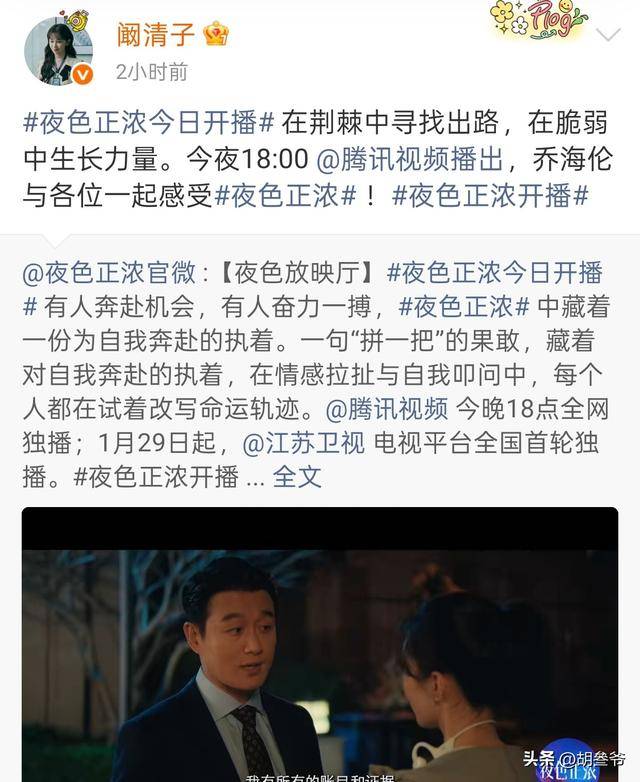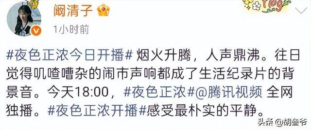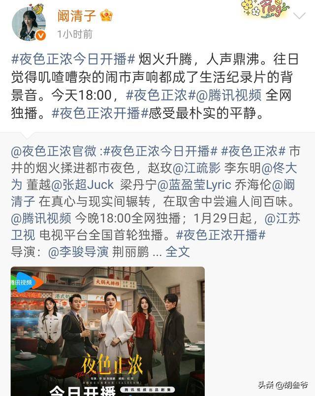 1月28日,沉寂了一个多月的阚清子突然在某博上连发四条动态,全都是宣传她主演的新剧《夜色正浓》。从剧海报到角色介绍,再到开播倒计时,每一条都充满了热情和期待。这是阚清子在
