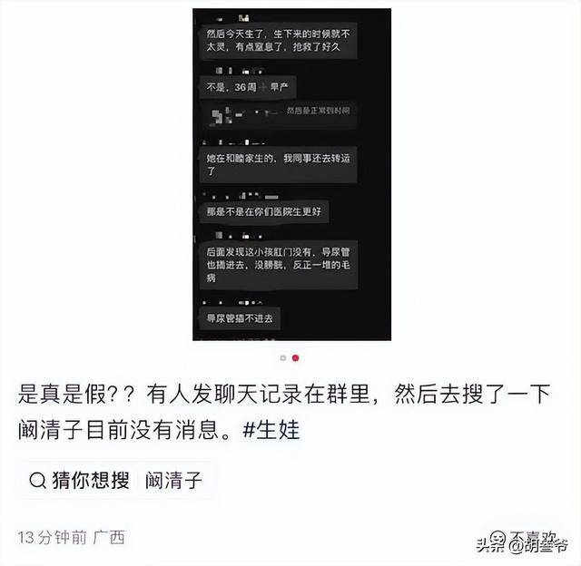 但就在大家都期待着宝宝出生的时候,12月23日,有匿名账号爆料称阚清子早产生女,婴儿因"先天畸形(无膀胱、无肛门)抢救无效去世",并附有伪造的医护聊天记录截图。