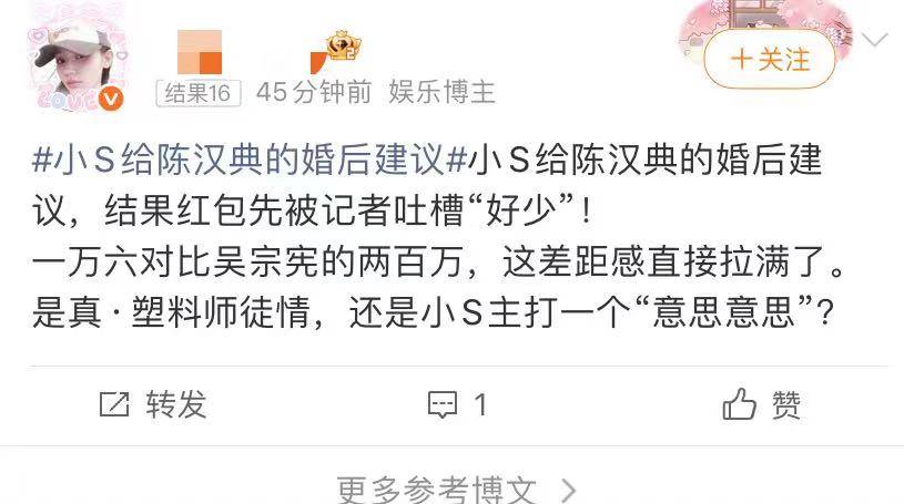网友拿小S和吴宗宪的红包比较,记者吐槽小S的红包好少,吴宗宪送出200万台币,折合人民币约44万元,所以小S还是不如吴宗宪大方。陈汉典是吴宗宪的亲徒弟,而小S只是熟人一个吧?