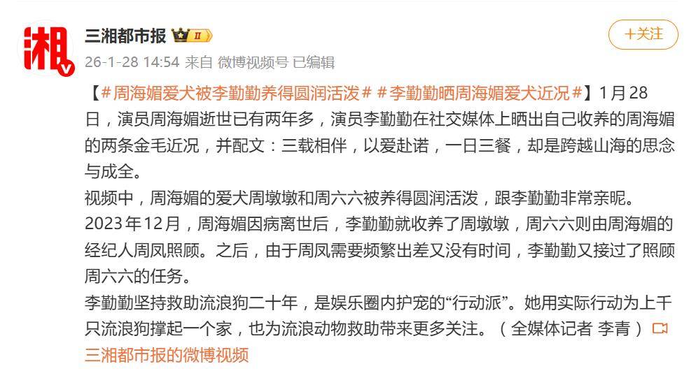 时间拨回2023年12月,演员周海媚的骤然病逝,留给亲友和粉丝无尽悲痛,也留下了她最牵挂的“毛孩子”们的归宿问题。当时,李勤勤便毫不犹豫地站了出来,收养了其中一只金毛周墩墩,并公开承诺:“一定会帮海媚照顾好毛孩子。”另一只金毛周六六,则暂时由周海媚的经纪人周凤照顾。
