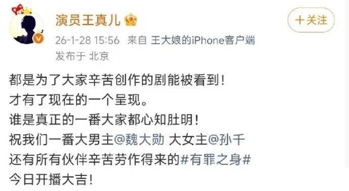 王真儿开播当日15:56发文,强调调整是"为剧能被看到才这样呈现",直言"真正一番心知肚明",并主动标注魏大勋为"一番大男主"、孙千为"大女主"呼吁聚焦作品。该回应被赞"顾全大局"化解争议。