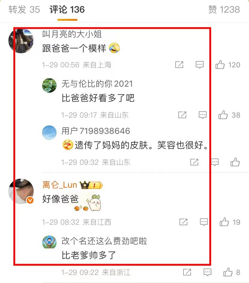 网友纷纷在白百何微博留言,表示元宝很像爸爸,但比爸爸帅气,也表示遗传了妈妈的皮肤,笑容也很好。结果就是元宝长得像爸爸,但比爸爸帅很多。