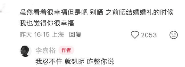 近日,李嘉格晒和男友接吻照被网友劝别晒,对此,李嘉格本人直接回应称:“我忍不住,就想晒,咋整你说。” 2025年9月11日李嘉格宣布与车澈离婚。11月车澈公开回应表示不后