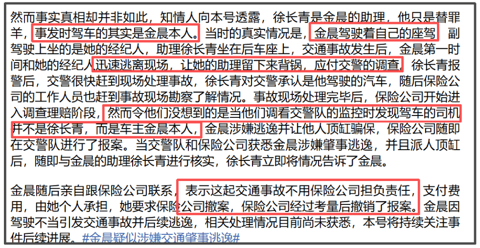 三个重点细节看完,不难发现除了金晨之外,金晨经纪人、助理都是帮凶,不出意外,保险公司也要承担责任。