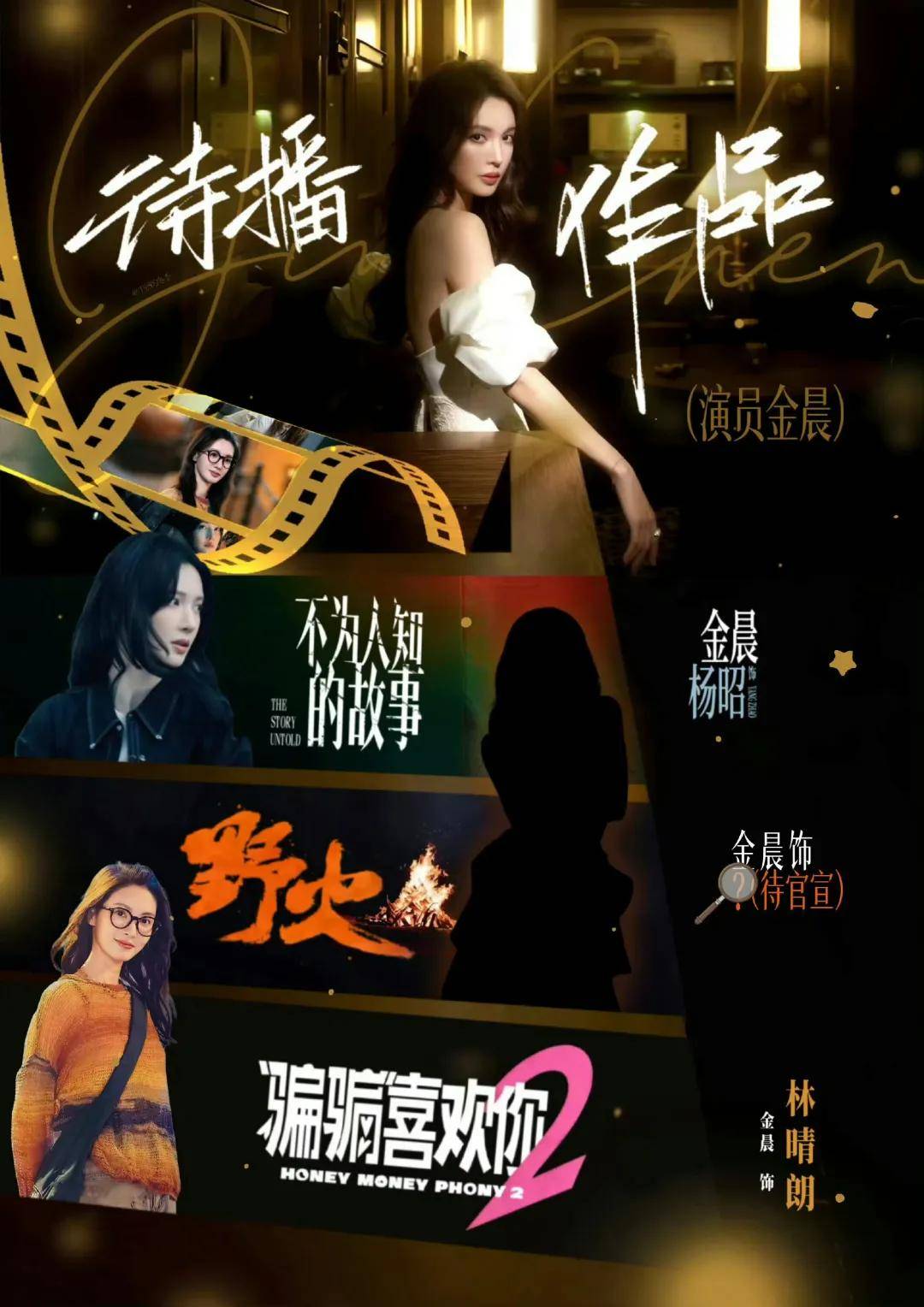 金晨手握三部待播作品,有电影有电视剧,班底和阵容都很不错,她还有一部即将开机的待拍剧,合作对象是黄景瑜。