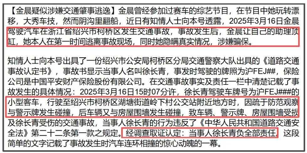 最近内娱大瓜不断,连狗仔爆料预告一线女星要变法制咖,都被外界忽略了,结果狗仔还真曝出了一个大瓜——35岁女星金晨被曝交通肇事逃逸,同时涉嫌找助理顶包,还涉嫌骗保。