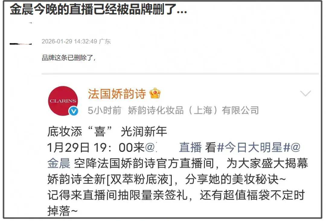 按照原定计划,金晨还要出席娇韵诗品牌直播,心疼打工人,又要忙着给明星收拾烂摊子,直播大概率取消了,品牌已删除了金晨直播预告。