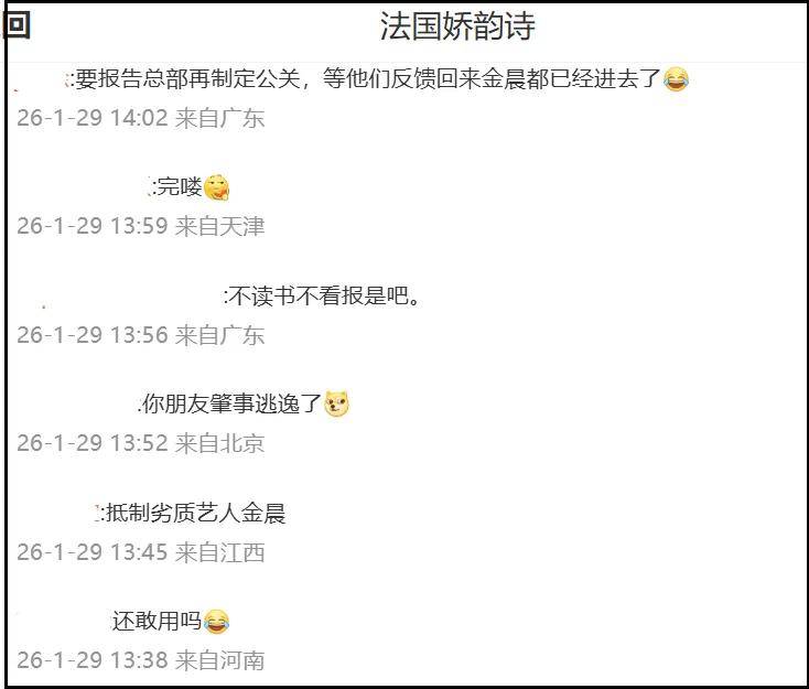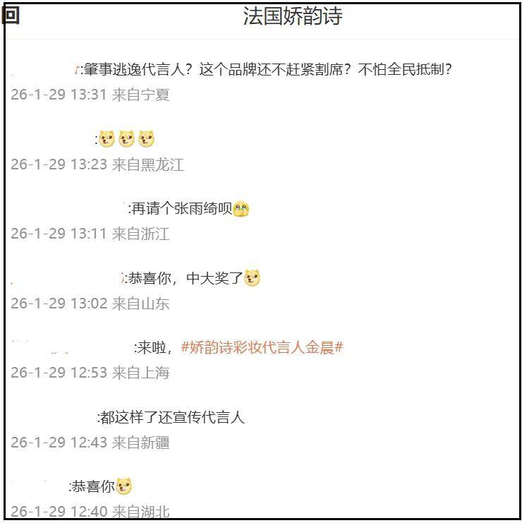 金晨本人和工作室没有第一时间回应爆料,错过黄金三小时公关期,针对她的质疑声越来越大,目前金晨最新代言娇韵诗的账号评论区已经沦陷了。
