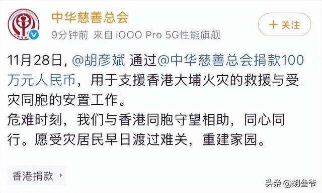2025年12月,香港大埔发生火灾,胡彦斌第一时间捐了100万。