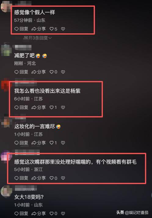 用网友所言:“怎么看也认不出她是杨紫,女大18变的这么明显,像个假人一样。”