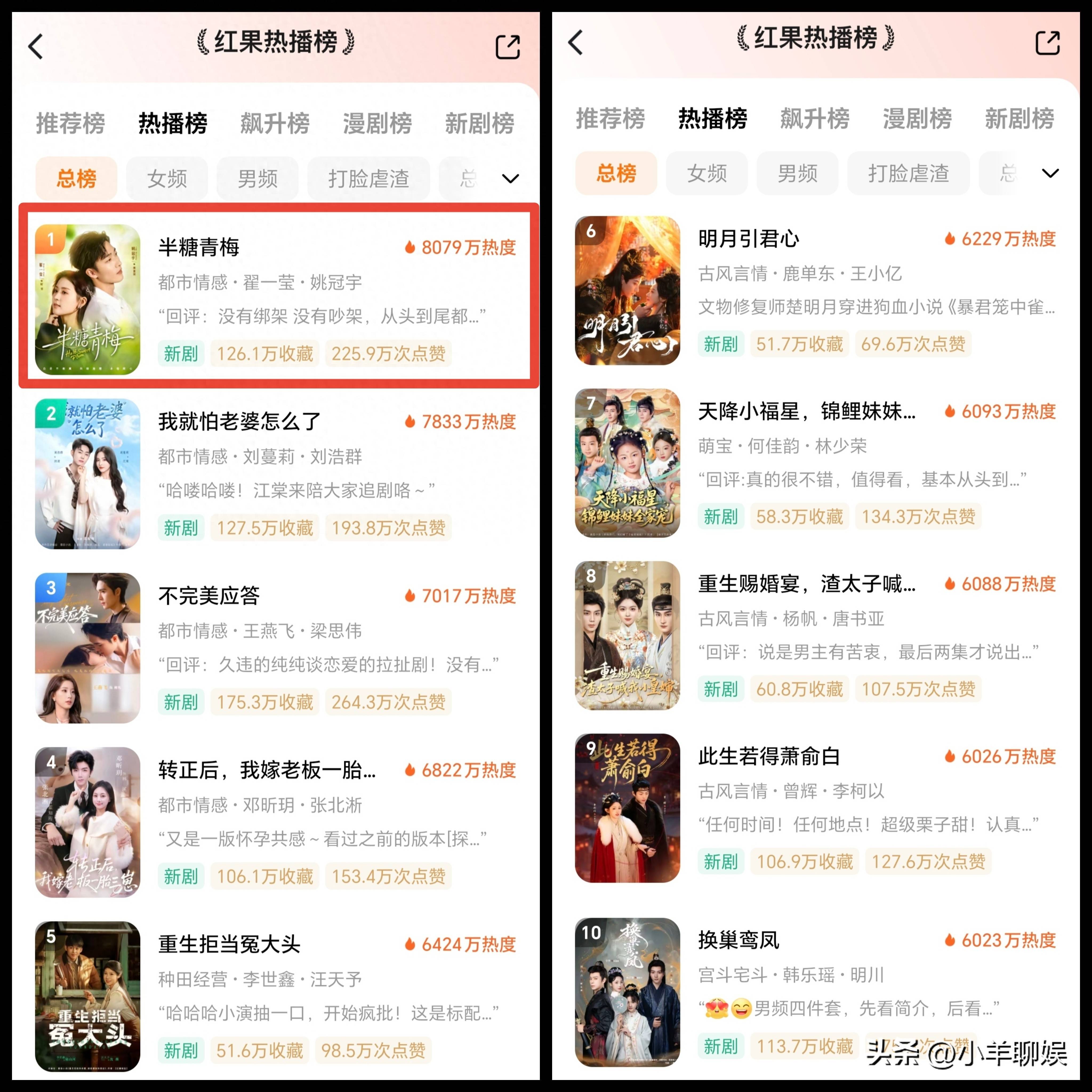 榜单最大惊喜莫过于姚冠宇的“回归”!他已经很长时间没有在红果上剧了,这次搭档翟一莹的新剧《半糖青梅》上线即爆,目前牢牢霸占榜一宝座!