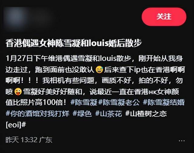 还有人看到了Louis给老婆认真的拍照,举着手弯着腰,一脸的认真,而陈雪凝面对镜头扬起了幸福的笑容,隔了老远都能看见。