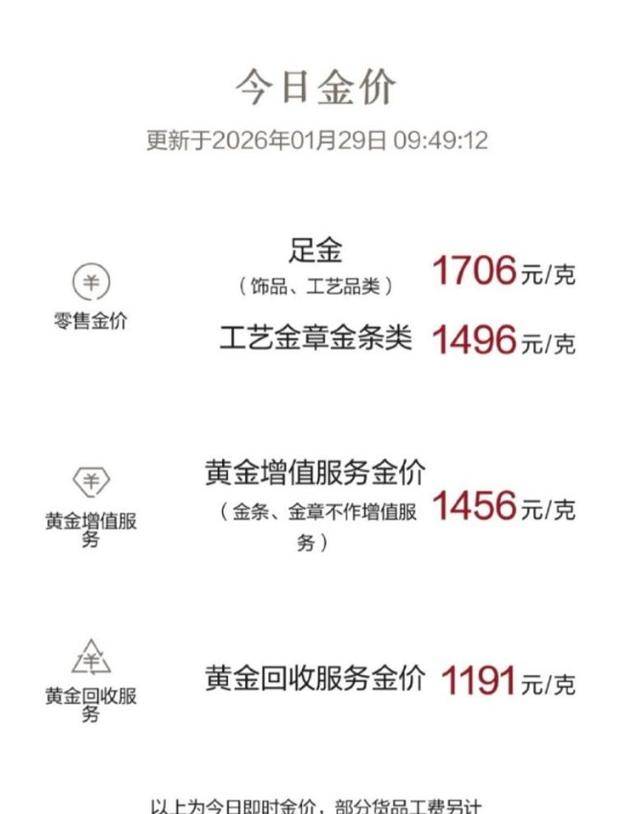 到2026年1月29日,国内金价暴涨,周生生、老庙黄金等品牌金饰价已达1700到1722元一克。