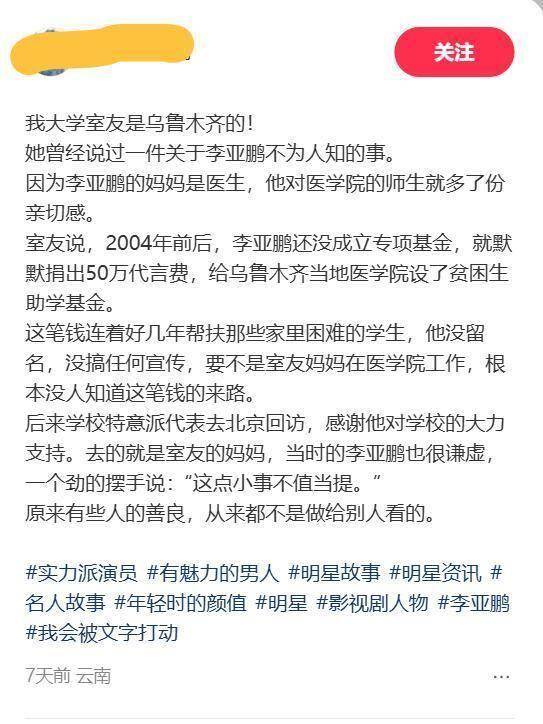 就在7天前,某社交平台博主甩出的猛料直接让评论区炸了锅:“我大学室友是乌鲁木齐的,她妈当年在当地医学院上班,说漏嘴一件李亚鹏的秘事儿。” 这爆料自带 “亲友团认证” buff,可信度直接拉满。