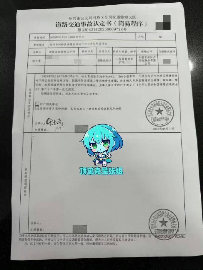 爆料说去年3月,金晨在浙江绍兴开车撞了警示牌和围墙,不仅撞坏了车,还把助理撞成了轻伤。但她没等交警来,就带着经纪人溜了,留下助理徐长青冒充司机顶罪,连事故认定书都写了助理的名字。
