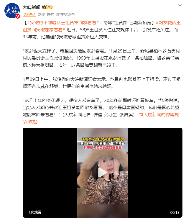 (来源:大皖新闻)近日,58岁王祖贤入住社交媒体平台,引发广泛关注。而33年前,她捐建的安徽舒城祖贤路也大变样。“家乡也大变样了,希望祖贤能回家乡看看。”1月29日上午,舒