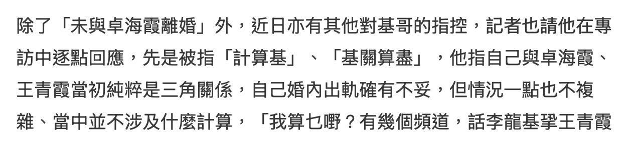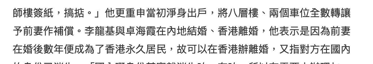 李龙基有过两段婚姻,在他21岁的时候就娶了第一任太太,之后生了大女儿、次子以及小女儿,不过当时因为不懂得珍惜,维持了十多年的婚姻关系就离婚收场了。离婚后一两年后,他就认识了第二任太太卓海霞,两人相恋了几年后在1998年结婚。卓海霞比李龙基小二十多岁,也就是说对方与李龙基在一起的时候年纪还很小,不过李龙基强调称是在对方年满18岁后才结婚的,且与对方在一起也有20多年,两人没有孩子。两人当年是在内地结的婚,后来卓海霞成为了香港公民,故此2019年离婚的时候,是在香港办理的。如今为了自证清白,李龙基不惜晒出与对方的离婚书,也真是豁出去了。