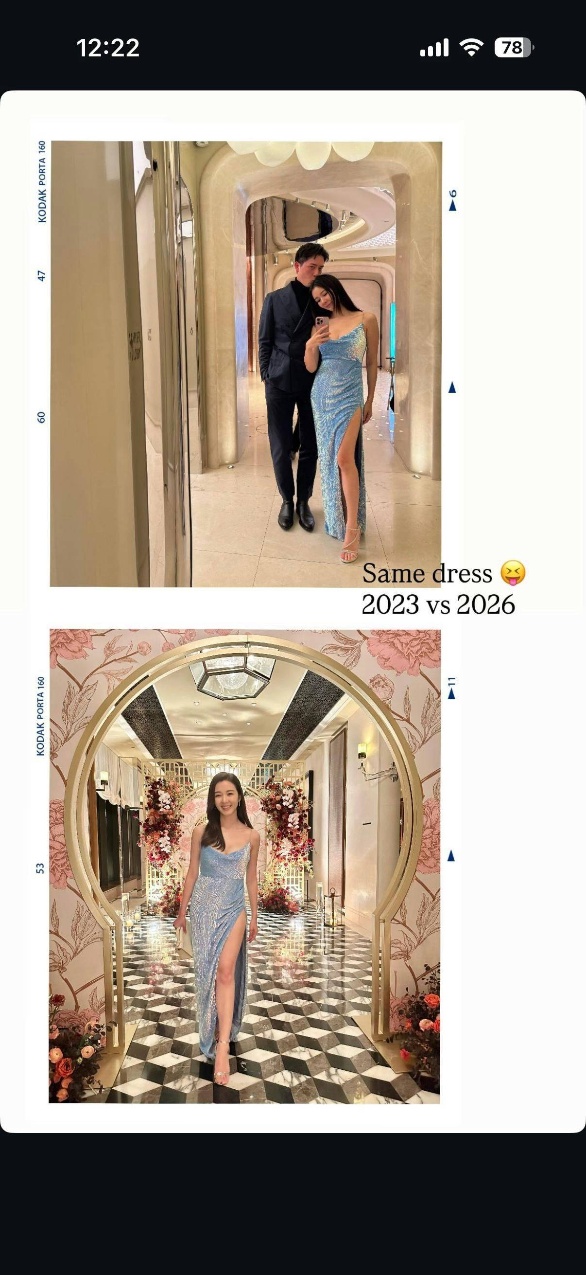 2023年3月首次穿着这条裙子时,麦明诗曾凭借修身剪裁凸显的曲线获得好评。低胸设计与高开衩裙摆展现出优雅气质,当时连艺人岑丽香、唐诗咏都留言称赞。而最近的照片中,她与丈夫并肩站立,裙装依然合身,容貌身材与三年前几乎毫无差异。